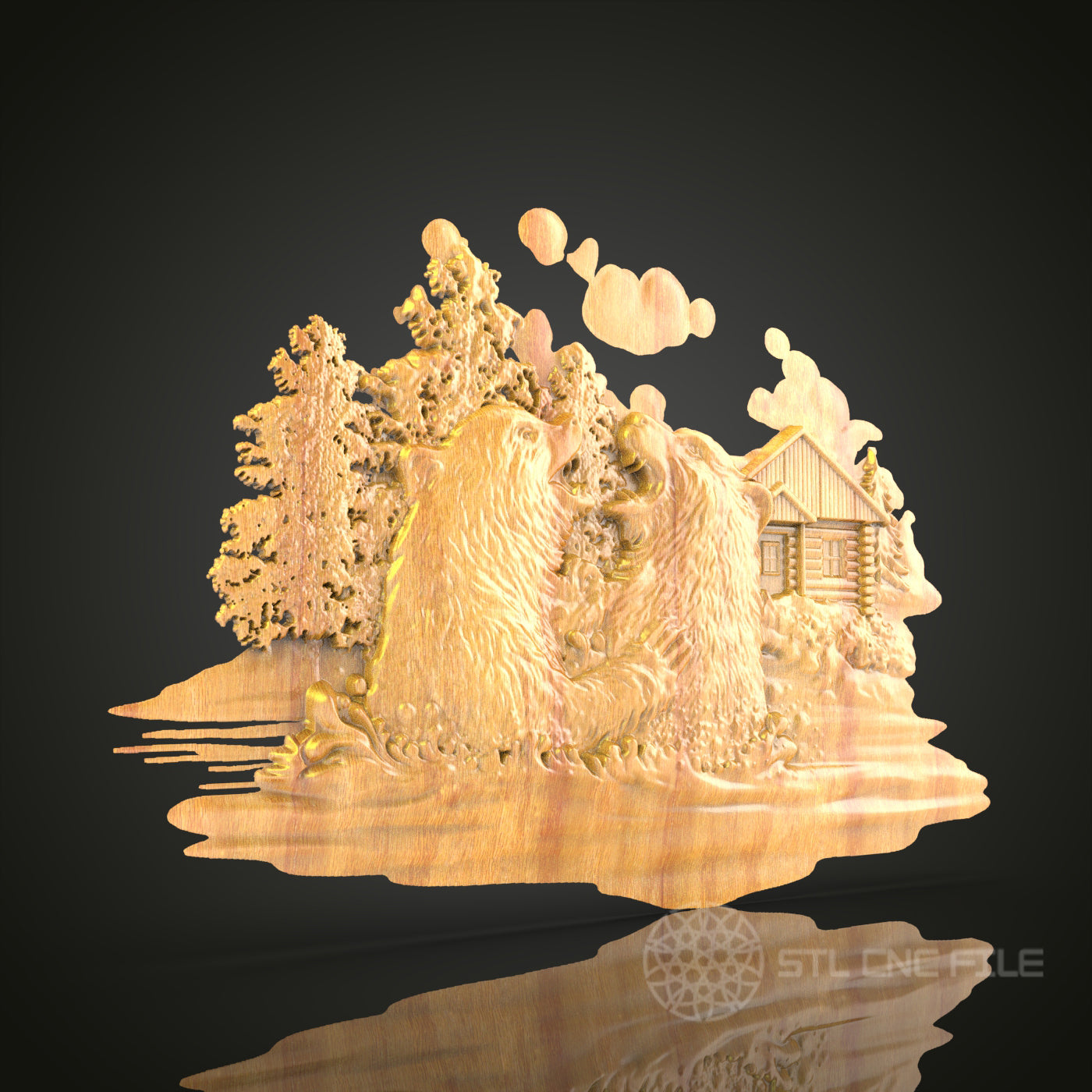 Forest Bears Scene STL File for CNC, 3D Wood Carving, Rustic Cabin Decor, Wildlife Art, Router Engraving
