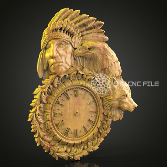 Tribal Chief Clock STL Model, CNC Router Engraving File, Artcam Aspire Artwork, Wildlife Wall Decor, Wood Carving 3D Design, CNC Digital