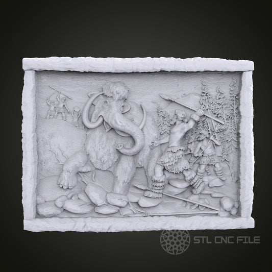Woolly Mammoth Hunt 3D Relief Art for CNC Router, Artcam, Aspire, Wall Decor, STL Model, Compatible with 3D Printers